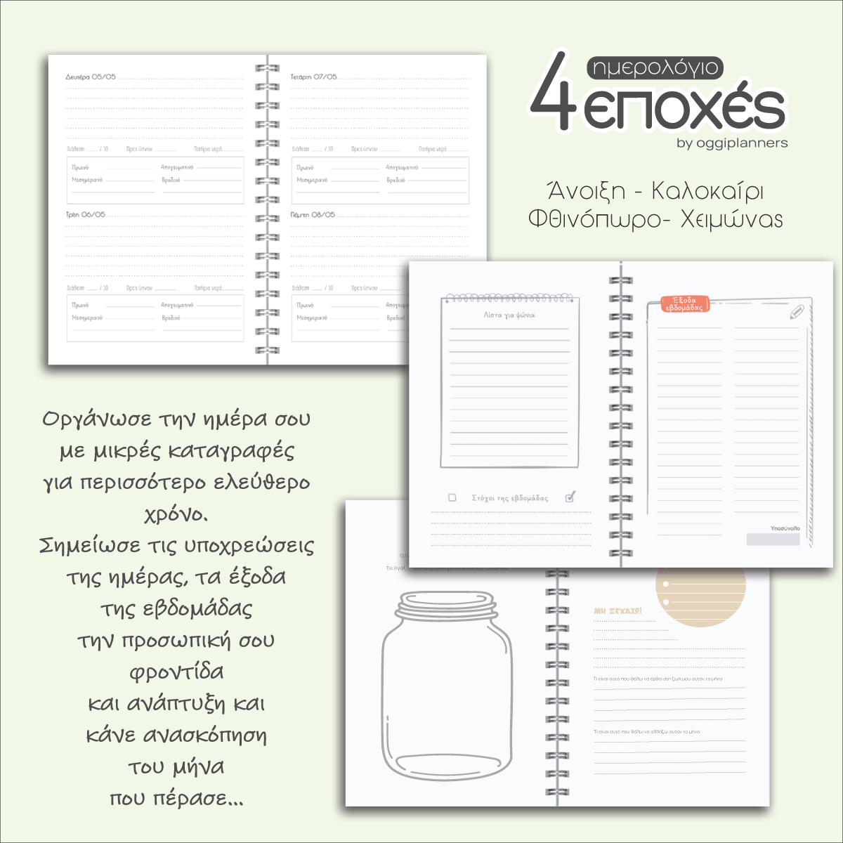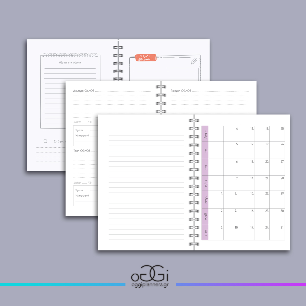 Οργάνωσε την ημέρα σου με μικρές καταγραφές, για περισσότερο ελεύθερο χρόνο! Σημείωσε τις υποχρεώσεις της ημέρας, τα έξοδα της εβδομάδας, την προσωπική σου φροντίδα και ανάπτυξη, και κάνε ανασκόπηση του μήνα που πέρασε. Γνώρισε τον εαυτό σου μέσα από μικρά βήματα καταγραφής συνηθειών και συναισθημάτων και κάνε το ημερολόγιο μέρος της καθημερινότητάς σου!